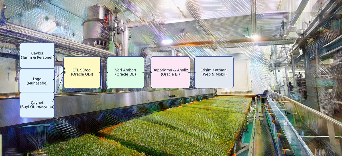 Çay fabrikasında üretimden gelen veriler Çaybis, Logo ve Çaynet uygulamalarına aktarılır. ETL süreciyle Oracle Veri Ambarı’na yüklenir, Oracle BI ile analiz edilir. Sonuçlar web ve mobil üzerinden yöneticilere sunulur.